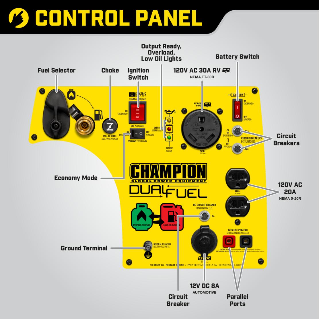 You also need to check the control panel of your Champion generator and confirm the available power outlets. If you need a generator that can power your whole house or RV, it should have 120/240V 30A AC outlets. The 120V 20A AC ports come in handy when connecting appliances, such as power tools directly to the generator.